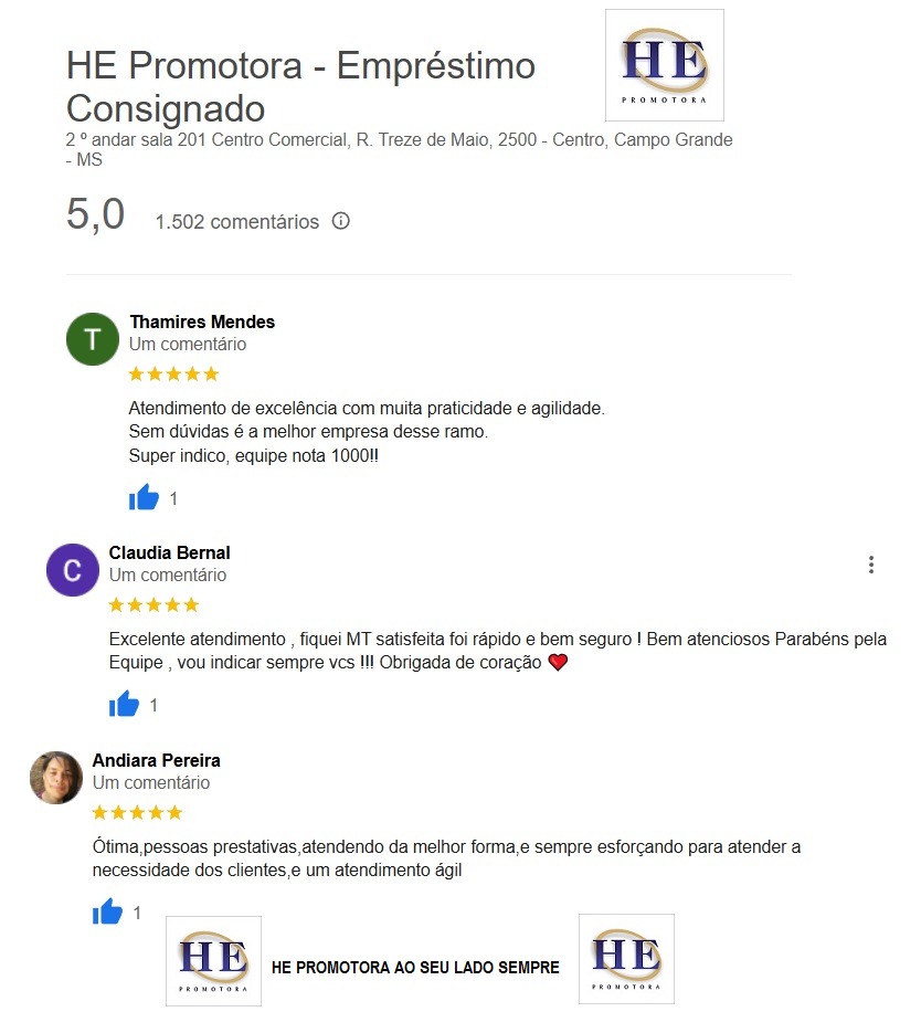 A HE Promotora é uma empresa de empréstimos consignados com avaliação 5 estrelas, sendo uma das mais renomada no Brasil. Com mais de um mil e quinhentas avaliações e comentários positivos no Google, a satisfação dos clientes é comprovada, refletindo a excelência no atendimento e a eficácia das soluções financeiras oferecidas.