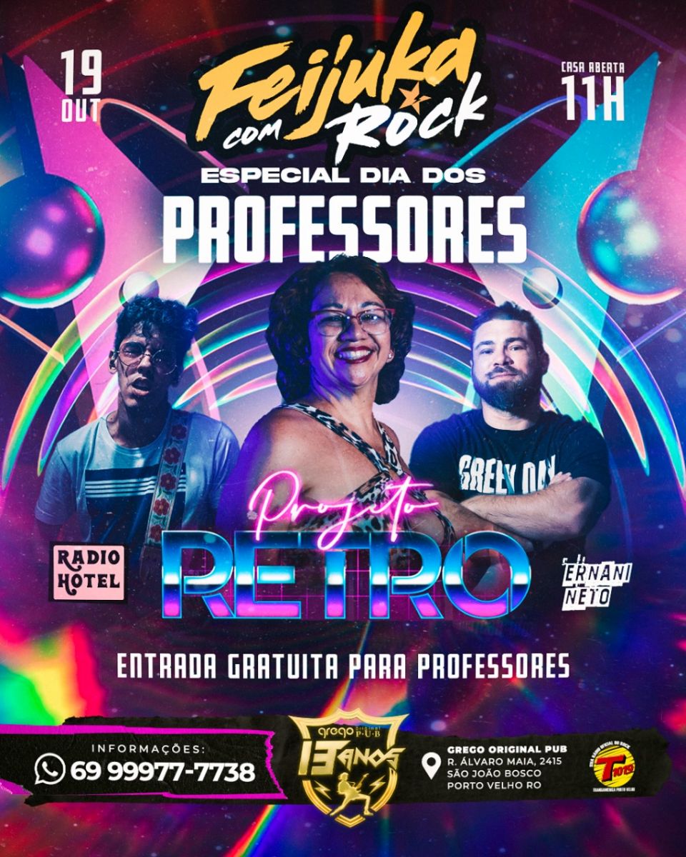 Essa edição da feijuka com rock será mais que especial, em comemoração ao dia dos Professores, banda Projeto Retrô numa apresentação inédita!