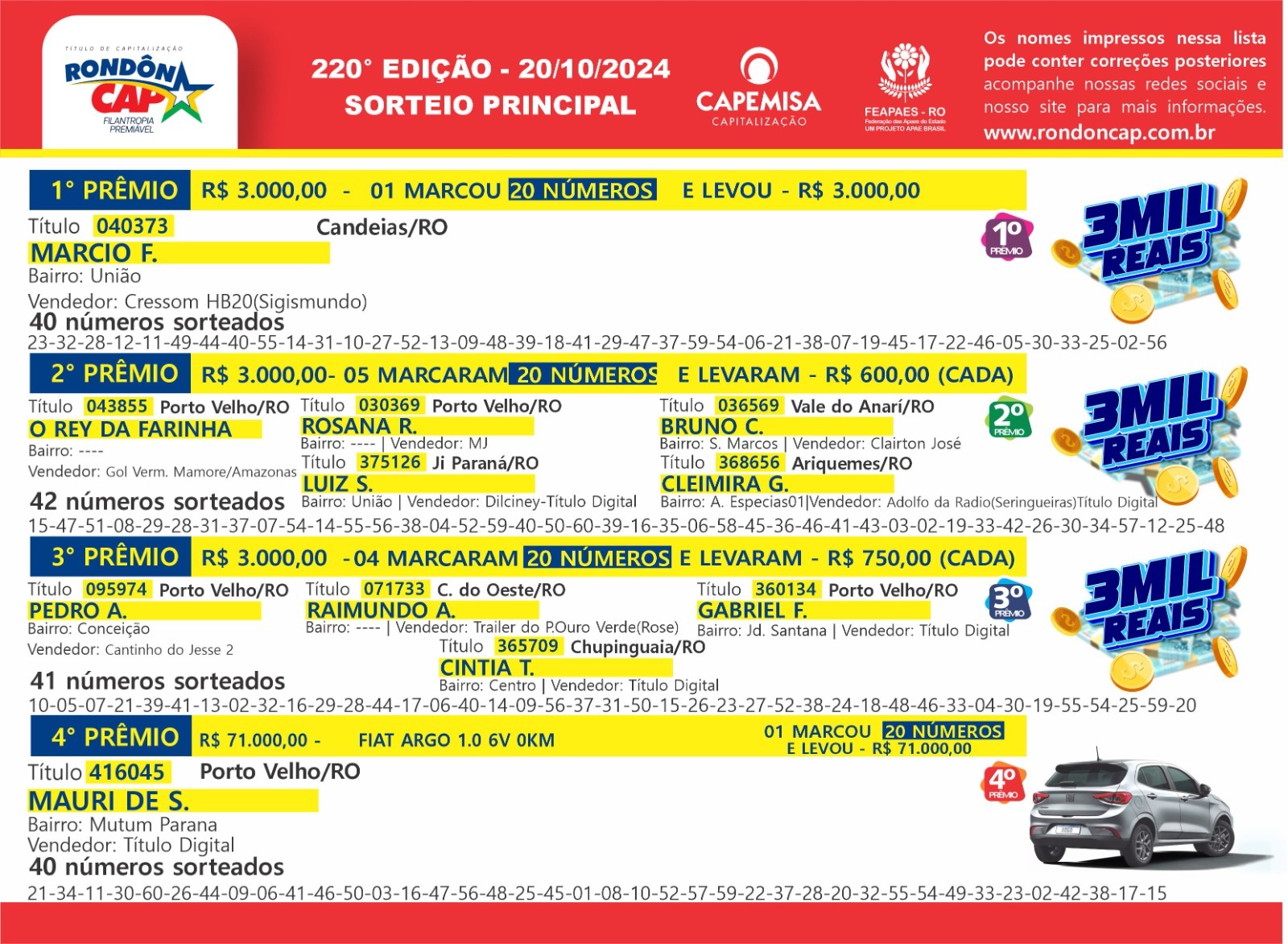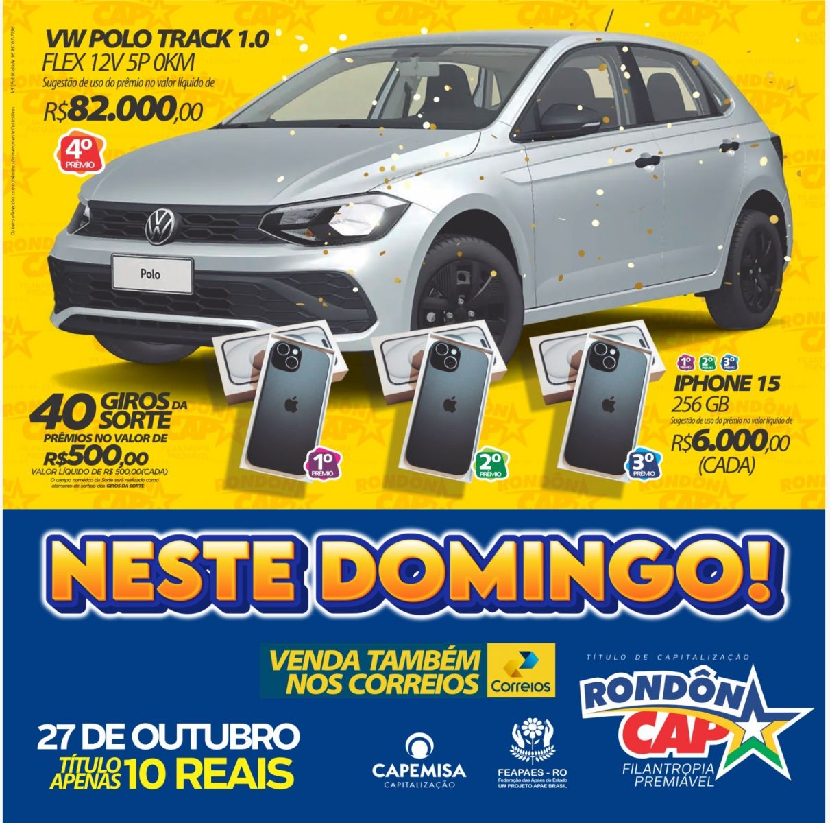 E ainda tem mais 3 Iphones 15 e 40 giros de 500 reais. Compre o seu RondonCAP Fisico ou Digital com o vendedor de sua preferencia por apenas 10 reais. Ajude as Apaes de Rondônia e participe!