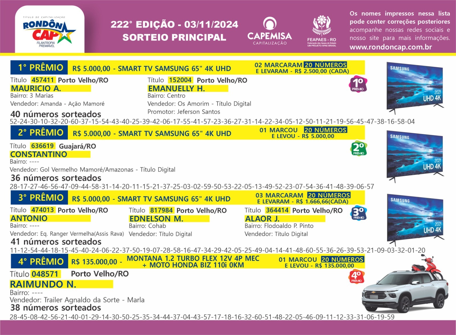 É uma máquina, é uma caminhonete e ela pode ser sua - ou você pode levar um PIX de 250 mil. E tem mais; são três Motos Honda POP e 40 Giros da Sorte de 500 reais. Sâo 300 mil em prêmios e o Titulo Dupla Chance de ganhar. Compre o seu RondonCAP fisico ou Digital com o vendedor de sua preferencia ou no ponto de vendas mais perto de você; ajude as APAES e participe!