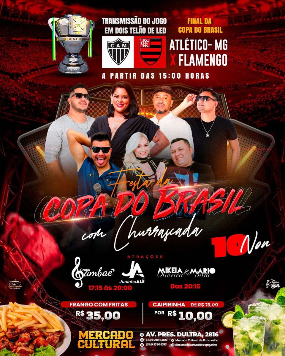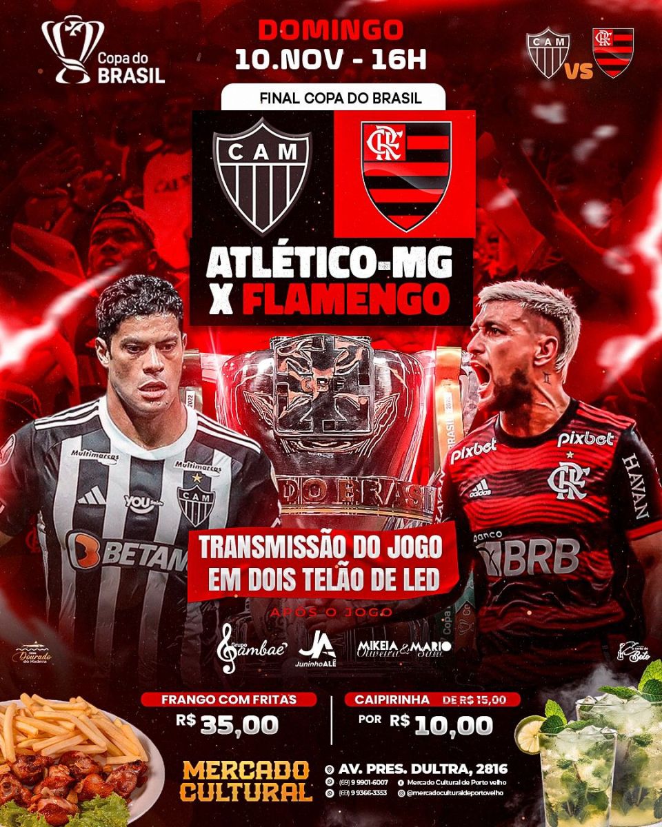 “Sem cobrança de entrada, couvert artístico e nem taxa de serviço, vamos colocar dois telões de LED, um na parte externa e outro telão na parte interna, para você acompanhar o jogo da Final da Copo do Brasil, entre Flamengo X Atlético MG”,