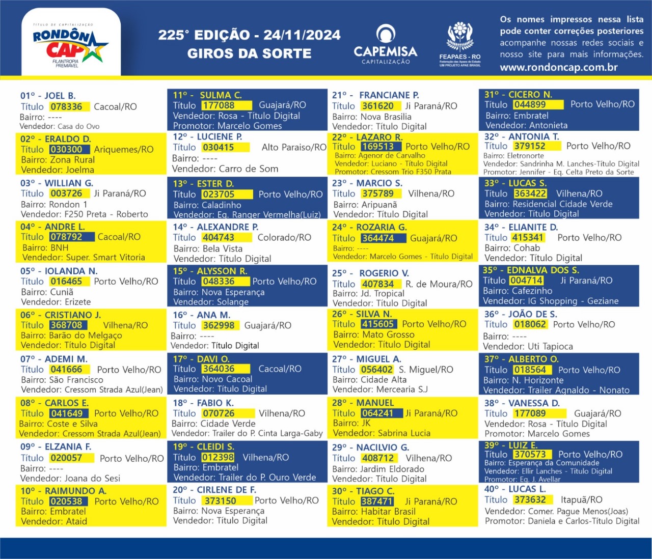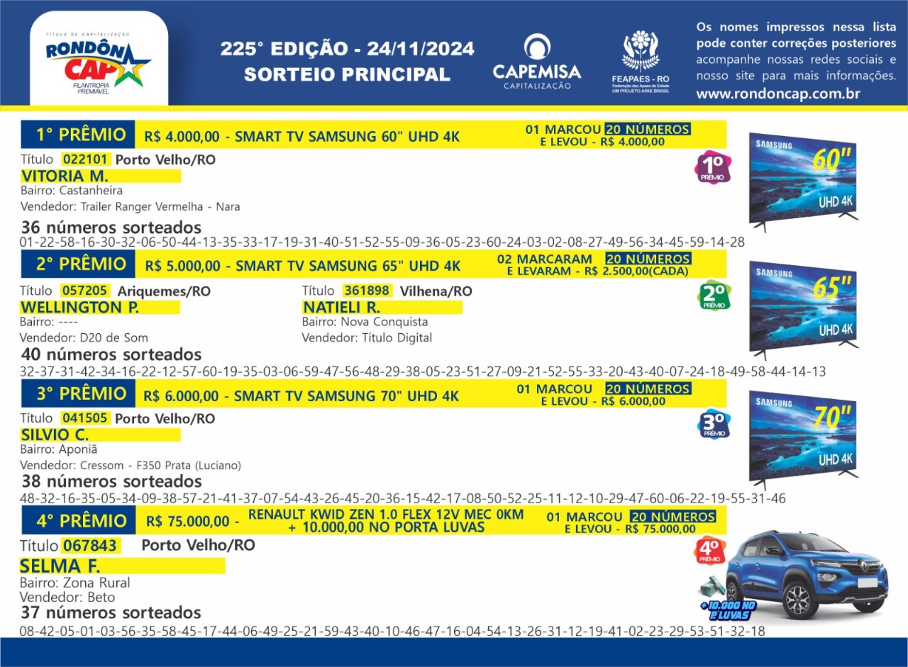 E ainda tem um prêmio de 4 mil, dois prêmios de 3 mil e 60 giros de 500 reais; é premio para família toda! Compre o seu RondonCAP Fisico ou Digital por apenas 5 reais com o vendedor de sua preferencia ou no ponto de vendas mais perto de você. Black Friday RondonCAP, só 5 reais! Ajude as APAES de Rondônia e participe!