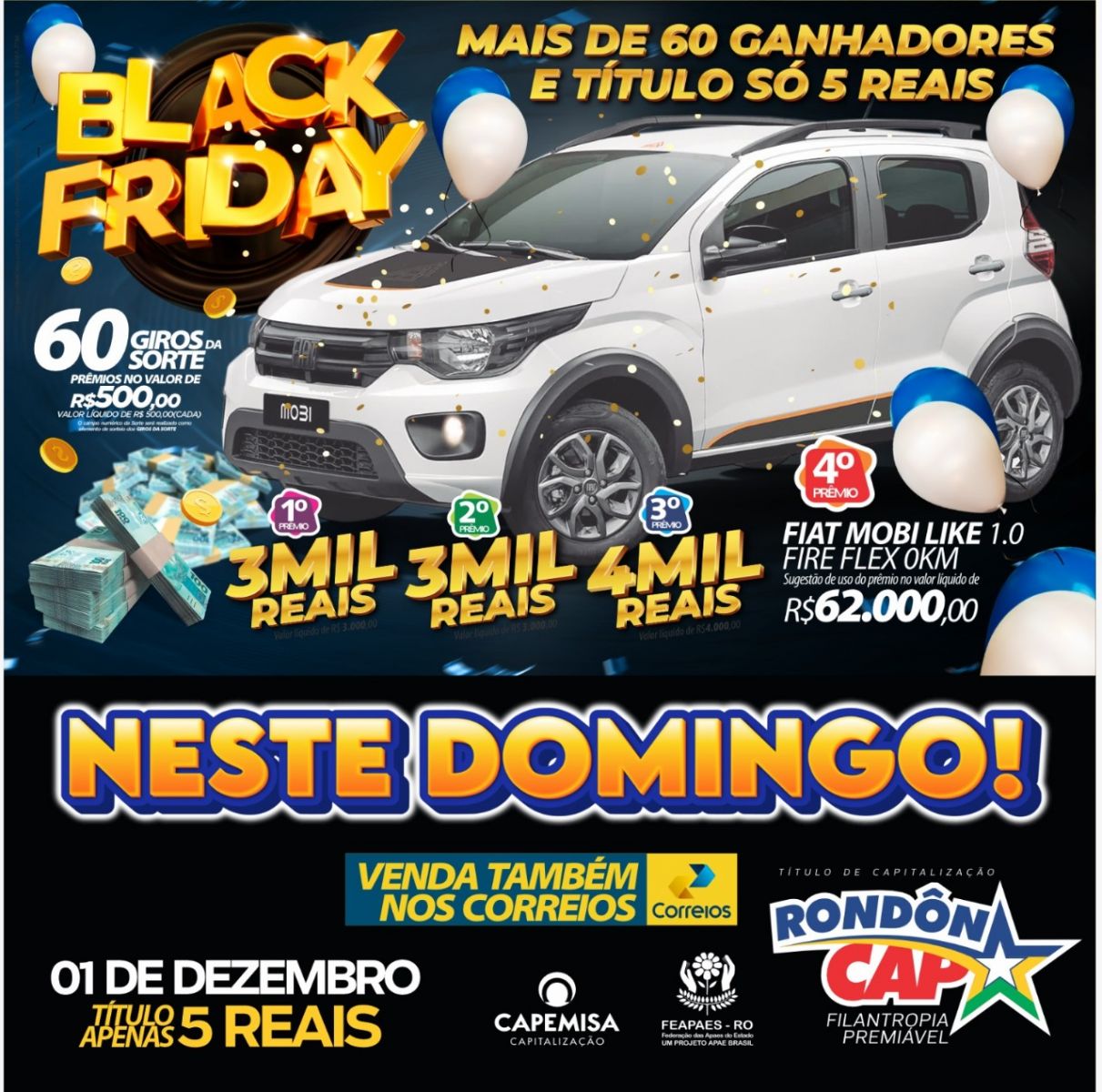 Neste domingo tem Black Friday RondonCAP! Serão mais de 60 ganhadores com um FIAT MOBI no 4º Prêmio e o Titulo só 5 reais!