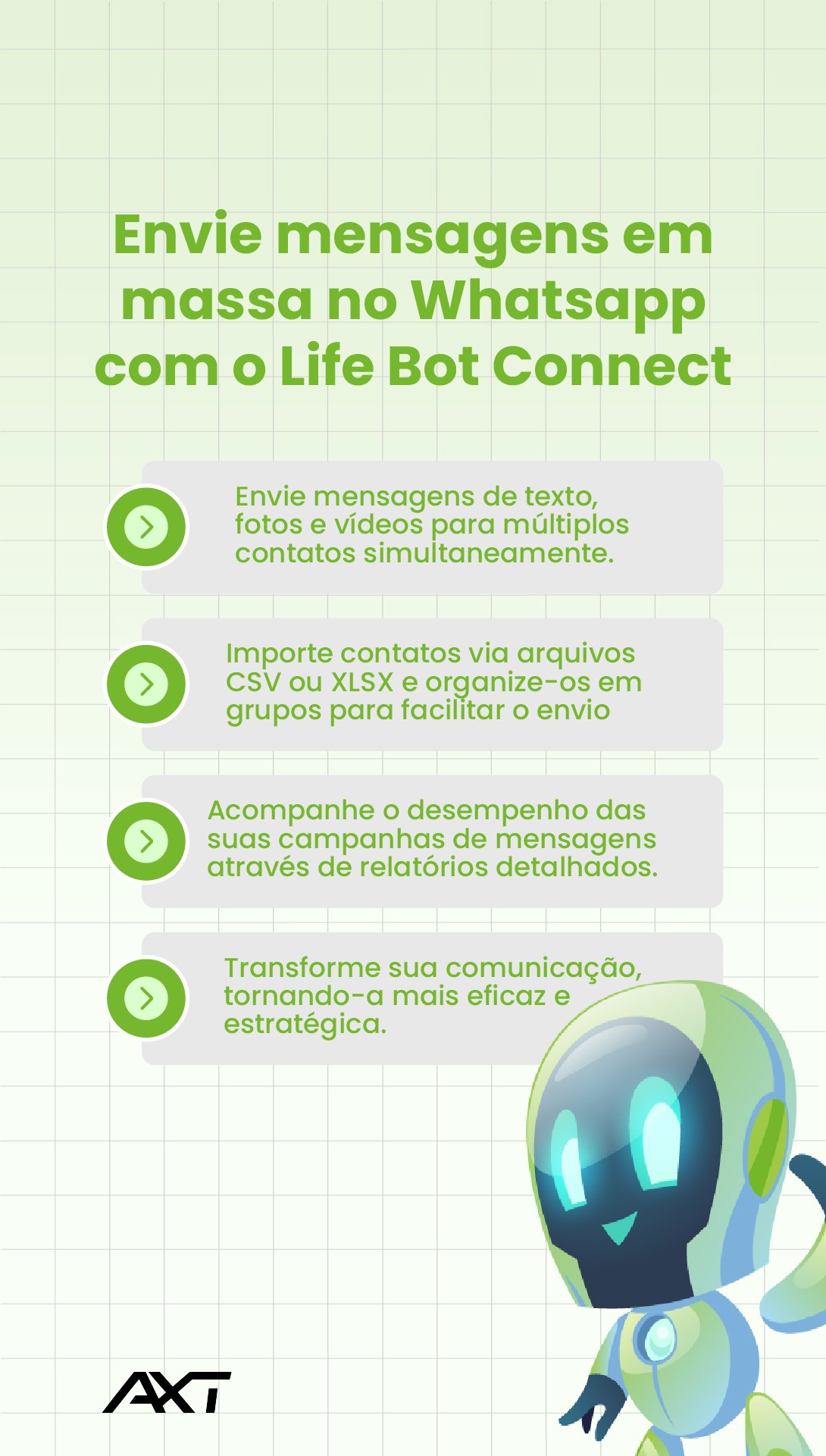 Com o LifeBotConnect, você tem a capacidade de enviar mensagens em massa para grupos e contatos de forma automatizada, o que significa mais alcance e eficiência sem precisar de horas de trabalho manual. A plataforma foi desenvolvida para economizar tempo e aumentar a produtividade, permitindo que você se concentre no que realmente importa: engajar seus clientes e gerar resultados. Ao automatizar o envio de mensagens, você consegue alcançar mais pessoas em menos tempo, mantendo a qualidade e a personalização da comunicação.