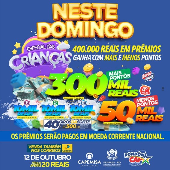 E neste domingo tem RondonCAP Especial do dia das Crianças, serão 400 mil reias em prêmios e quem fizer mais pontos ganha, quem fizer menos pontos, também ganha!