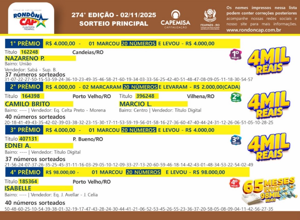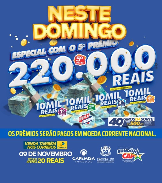 É o RondonCAP Especial de novembro, são 4 prêmios de 10 mil reais e 220.000 reais no 5º e Especial Prêmio!