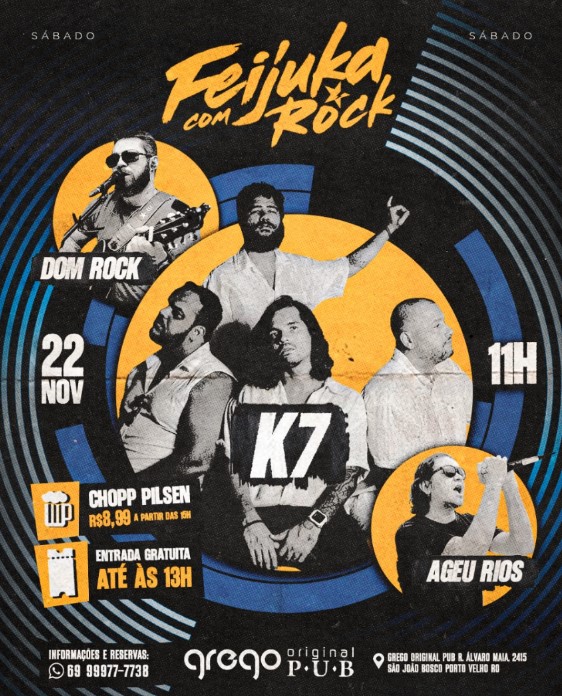 Pra quem curte a programação musical, no palco principal teremos banda Dom Rock e banda K7 no palco principal. No espaço lounge, Ageu Rios.