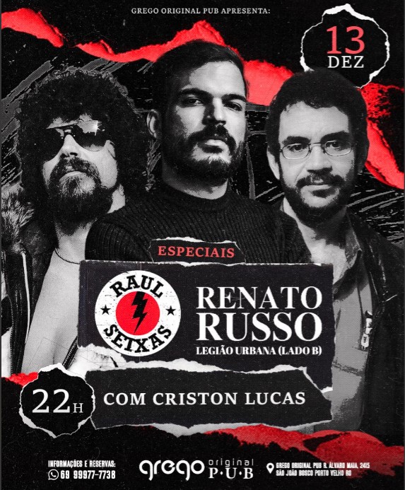 Dia 13/12, Criston Lucas apresenta um encontro histórico: Raul Seixas e Renato Russo. Duas mentes brilhantes, dois poetas eternos. Casa aberta a partir de 22h.