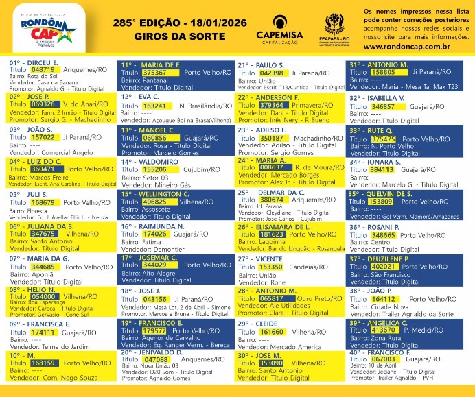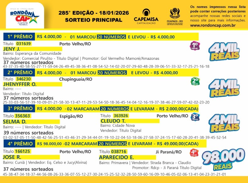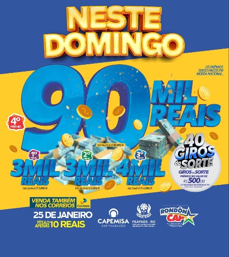 E neste domingo o RondonCAP vai sortear 44 prêmios em dinheiro, tem uma bolada de 90 mil reais no 4º Prêmio e o Título só 10 reais. É dinheiro para sair do aperto e pagar todas as contas de início de ano.