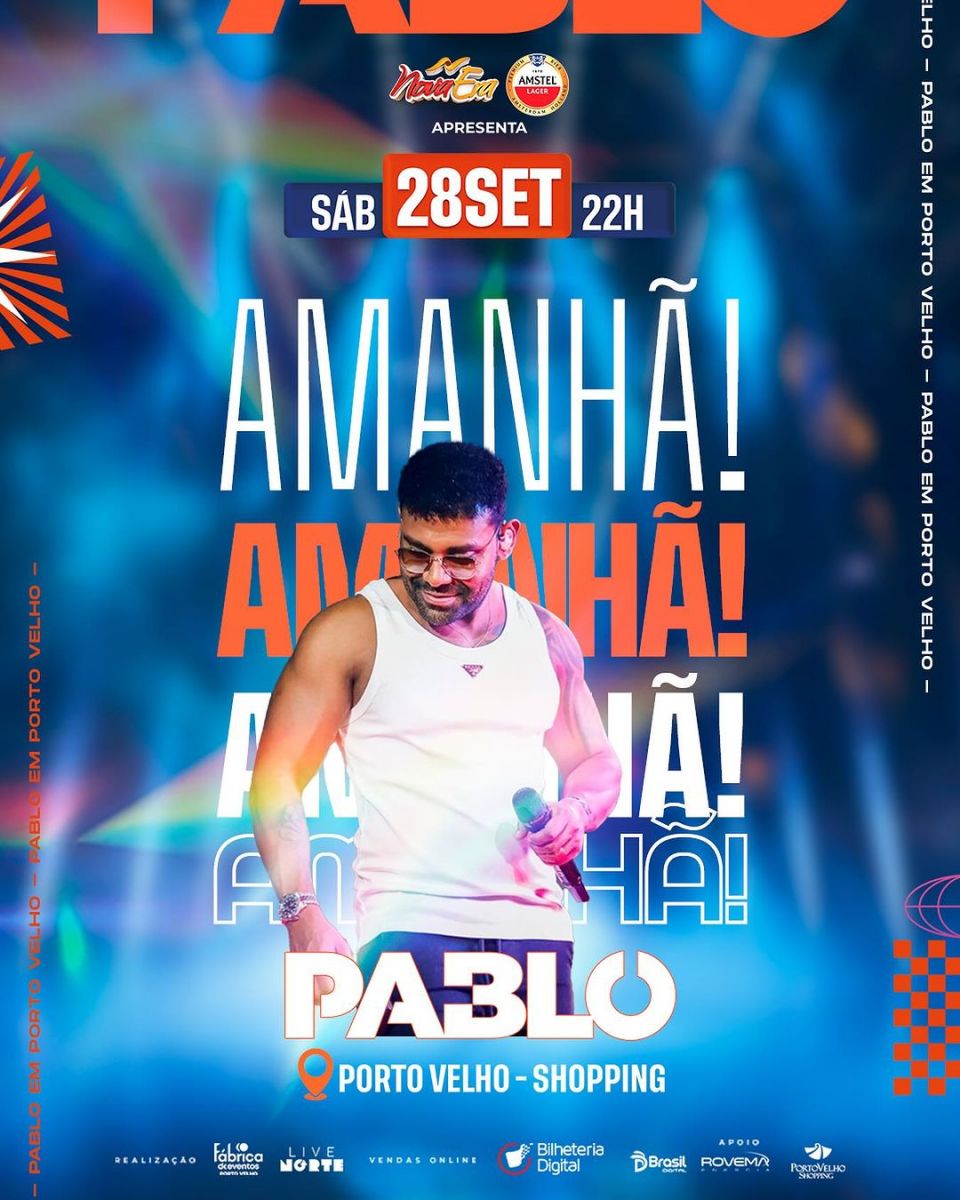 É HOJÉ! 28 de setembro, mais um grande show em Porto Velho. Pela primeira vez na capital Pablo do arrocha no estacionamento do Porto Velho Shopping.
