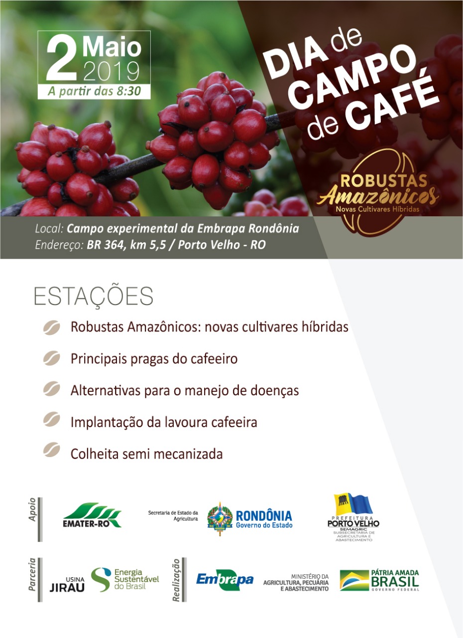 Este é o sexto dia de campo sobre o assunto, que já foi realizado em outros municípios de Rondônia e também do Acre. Durante o evento, o público poderá conhecer as características das novas cultivares em campo, serão abordadas as principais pragas dos cafeeiros, alternativas para o manejo de doenças, implantação de lavoura e também a colheita semi-mecanizada do café.