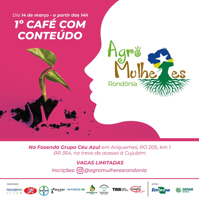 O 1º Café com Conteúdo Agro Mulheres Rondônia será realizado no dia 14 de março, das 14h às 17h, na propriedade do grupo Céu Azul, localizada na cidade de Ariquemes, na RO 205 km, 1 - BR 364, no trevo de acesso à Cujubim. As vagas são limitadas e as inscrições podem ser feitas online, no endereço: http://bit.ly/2ubZyYC. Mais informações no Instagram @agromulheresrondonia.
