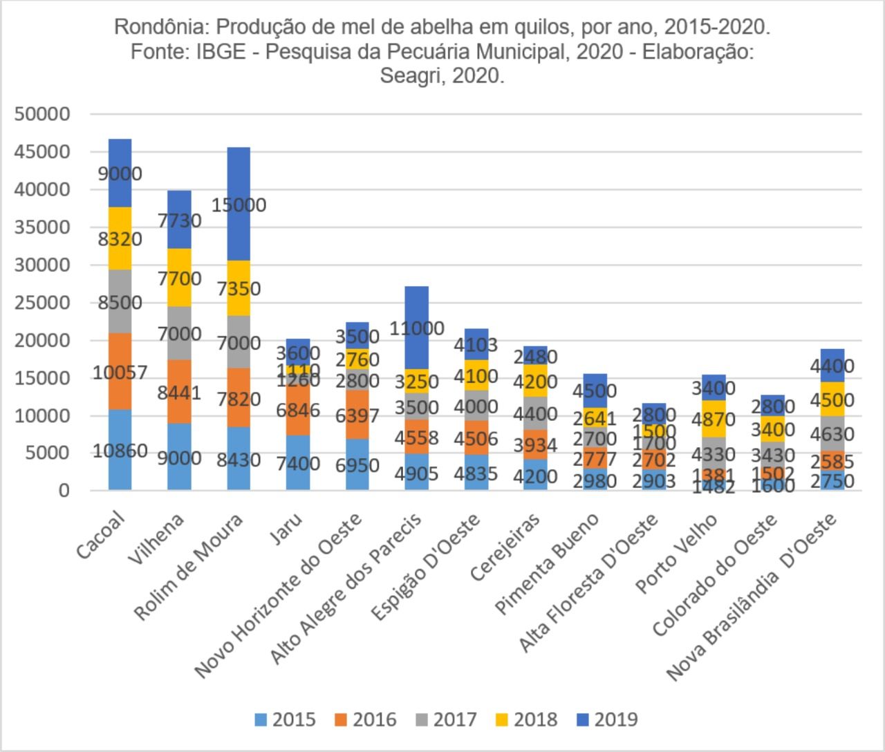 De acordo com o Instituto Brasileiro de Geografia e Estatística (IBGE), em 2019, o Estado de Rondônia produziu aproximadamente 98 toneladas de mel de abelha, o que representa de 0,21% da produção nacional. Segundo a Associação Brasileira de Exportadores de Mel (Abemel), Rondônia ocupa a 8ª posição no ranking nacional, com produção de 84,7 t/ano (IBGE, 2016), com faturamento aproximado de R$ 2,5 milhões/ano, com apenas 395 apicultores, conforme informações da Entidade Autárquica de Assistência Técnica e Extensão Rural (Emater Rondônia).