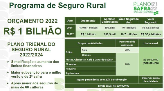 Neste governo, o seguro rural foi ampliado, mais que dobrando a área segurada e os produtores atendidos. Para 2022, a subvenção ao Prêmio do Seguro Rural será de R$ 1 bilhão. Com esse montante, será possível contratar aproximadamente 158.500 apólices, proteger 10,7 milhões de hectares e um valor total segurado de R$ 55,4 bilhões.