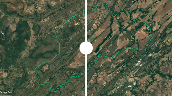 Comparação entre imagens de 1985 (esq.) e 2020 (dir.) mostram que região passou a ser recortada por pasto e culturas de soja e milho. Em destaque, limites da APA.