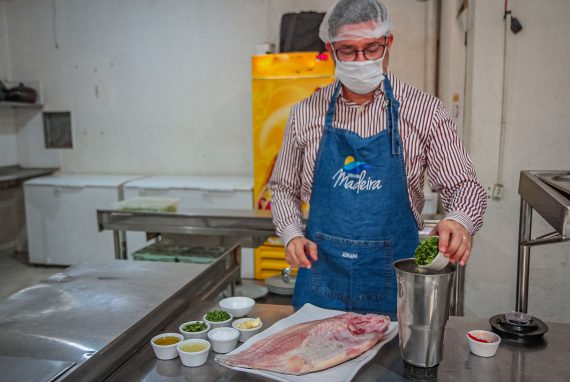 Na cozinha, o empresário mostra o passo a passo de um dos principais pratos servidos no restaurante: tambaqui assado na brasa sem espinha. Na banda do tambaqui já limpa e sem as espinhas, ele acrescenta uma pasta de temperos que inclui colorau (urucum), cebola picada, cheio verde, alho, chicória, sal, azeite e limão. O tempero é colocado sobre o peixe, incluindo as entranhas, deixando a cor diferente e o sabor sensacional depois de assado na brasa.