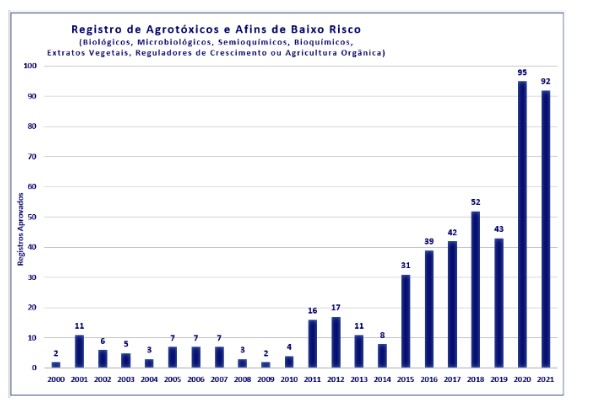 Em 2021, o número de registros é bastante expressivo: 92 produtos registrados, principalmente à base de agentes biológicos ou microbiológicos e extratos vegetais para o controle de pragas e doenças na agricultura. Em 2020, foram 95 registros.