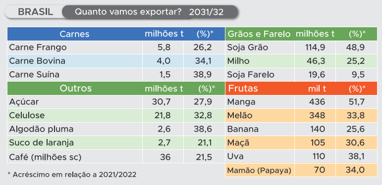 As exportações de carne suína devem crescer 38,9% na próxima década, chegando a 1,5 milhão de toneladas. Carne bovina e de frango também devem crescer, respectivamente 34,1% e 26,2%. Nos grãos, o destaque das exportações é a soja em grão, com previsão de crescimento de 48,9%, chegando a 114,9 milhões de toneladas. Algodão em pluma e celulose também devem ganhar espaço no mercado externo, com crescimento de 38,6¨e 32,8% nas exportações.