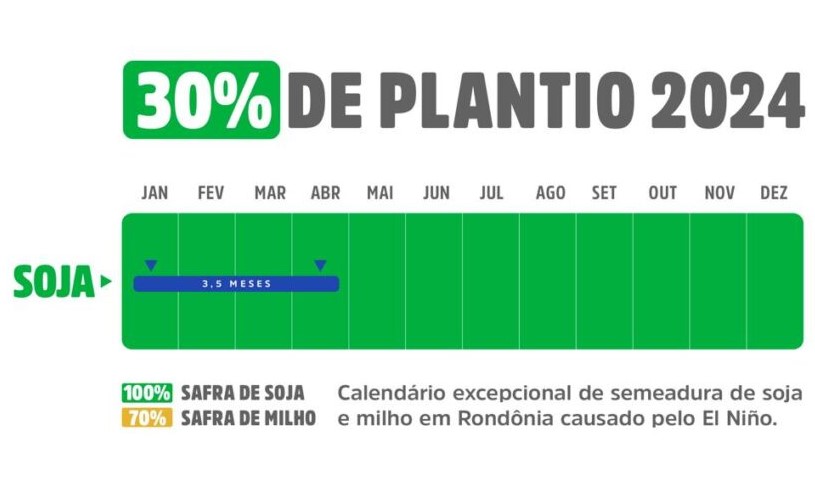 Em outras regiões, que representam 30% da área de produção a exemplo de Porto Velho e Nova Mamoré, a dilatação do prazo para semeadura de soja permitiu que o produtor esperasse um pouco mais. Nessas regiões, o processo ocorreu na segunda quinzena do mês de dezembro e primeira quinzena de janeiro, época em que houve mais registros de chuva, enquanto as primeiras plantações (aquelas que compõem os 70% de área plantada) começaram no final de outubro.