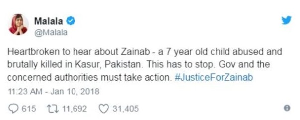 Nas redes sociais, a hashtag #JustiçaparaZainab ficou entre as mais comentadas no Twitter, sendo compartilhada por mais de meio milhão de usuários. A estudante e ativista paquistanesa Malala Yousafzai, ganhadora do prêmio Nobel da Paz, também comentou o caso. "Isso tem de parar. O governo e as autoridades responsáveis precisam agir", tuitou ela.