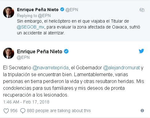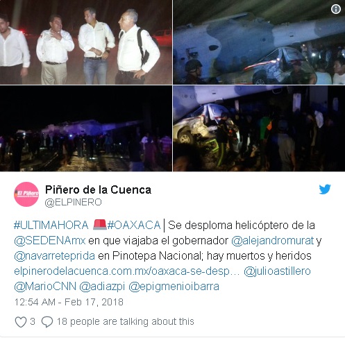 O acidente ocorreu durante um voo de inspeção das áreas atingidas pelo terremoto de magnitude 7,2 no sudoeste do México. Sobre o acidente, o presidente do México, Enrique Peña Nieto, postou em sua conta no Twitter as condolências. "Várias pessoas em terra que perderam a vida", escreveu.