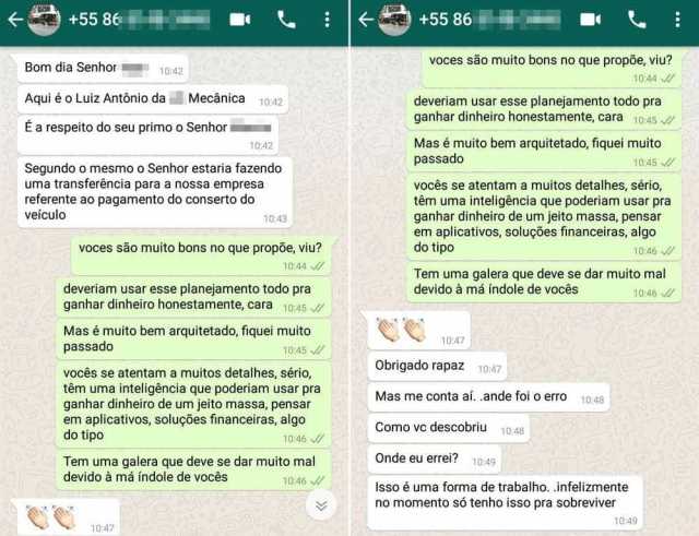 Na última ligação antes da mensagem pelo WhatsApp, o golpista, "primo" da vítima, disse que precisava de dinheiro. “Ele contou que os mecânicos não tinham cartão e que não havia onde sacar dinheiro. Eu já tinha desconfiado de algumas coisas, mas nesse momento eu tive certeza que era um golpe”, contou.