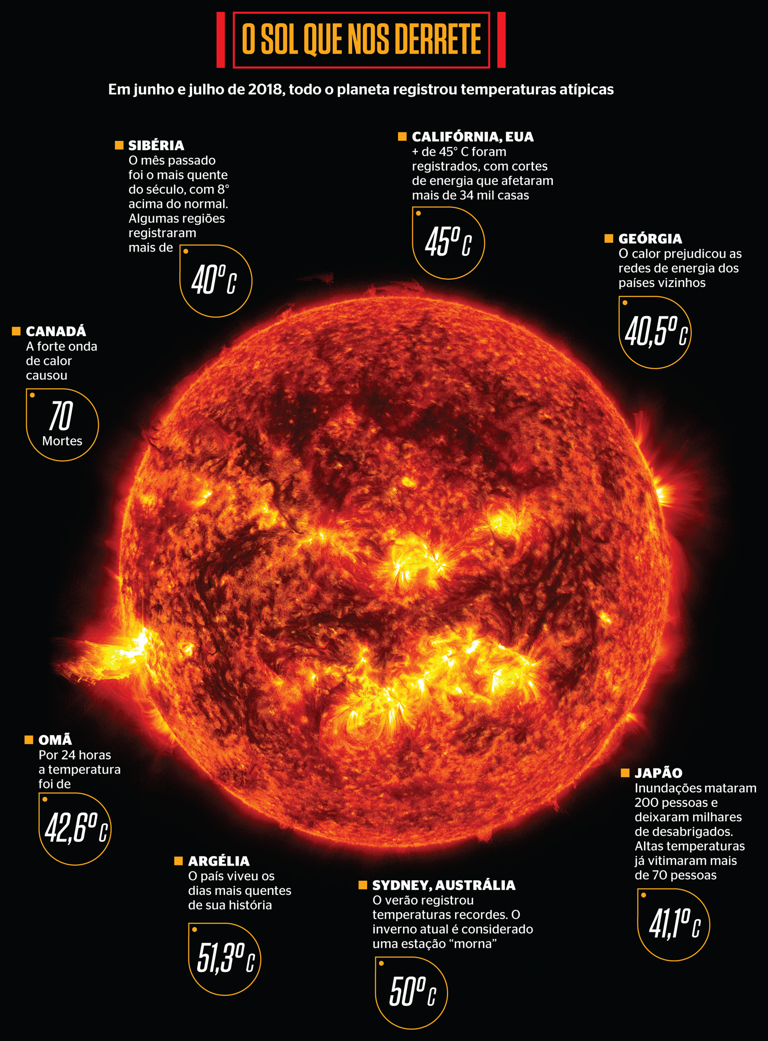 No Círculo Polar Ártico, as temperaturas atingiram picos de 30ºC e a Sibéria teve em junho uma média oito graus acima do normal. No Canadá, mais de 70 pessoas, a maioria idosos, morreram devido às temperaturas elevadas depois que uma a massa de ar quente dominou cidades acostumadas ao frio. O calor é dramático por provocar consequências desastrosas como racionamento de água, cortes de energia e, muitas vezes, incêndios florestais. A Suécia precisou pedir ajuda internacional para debelar mais de 50 focos de incêndios. Eventos extremos no clima são a resposta do planeta aos efeitos da contínua degradação provocada pelas atividades do homem — e confirmam que a Terra está mais quente a cada ano.