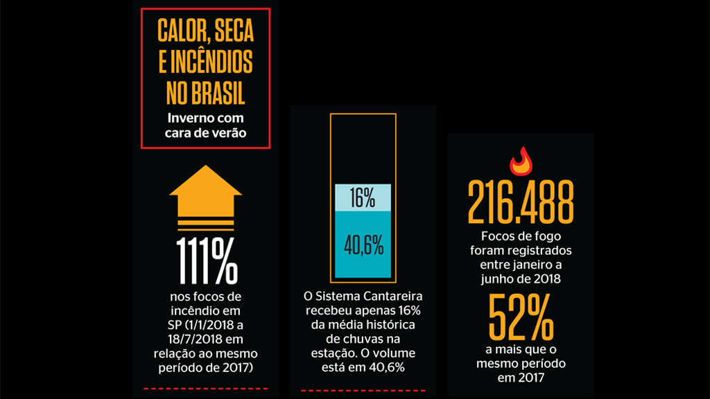 As alterações no clima já são percebidas no Brasil. Diversas regiões enfrentam um inverno mais quente e seco, o que se refletiu em aumento no número de incêndios florestais. Dados do Instituto Nacional de Pesquisas Espaciais (Inpe) mostram que os focos de fogo em 2018 cresceram 52% em relação a 2017. Em abril, antes mesmo do período de seca ser considerado crítico, o Distrito Federal decretou estado de emergência ambiental por conta do risco de incêndios. As bacias hidrográficas do País também estão sofrendo com as alterações climáticas. Apenas no Nordeste, dos cerca de 521 reservatórios monitorados pela Agência Nacional de Águas (ANA), 214 estão abaixo de 30%, mesmo com as medidas de restrição de uso da água.