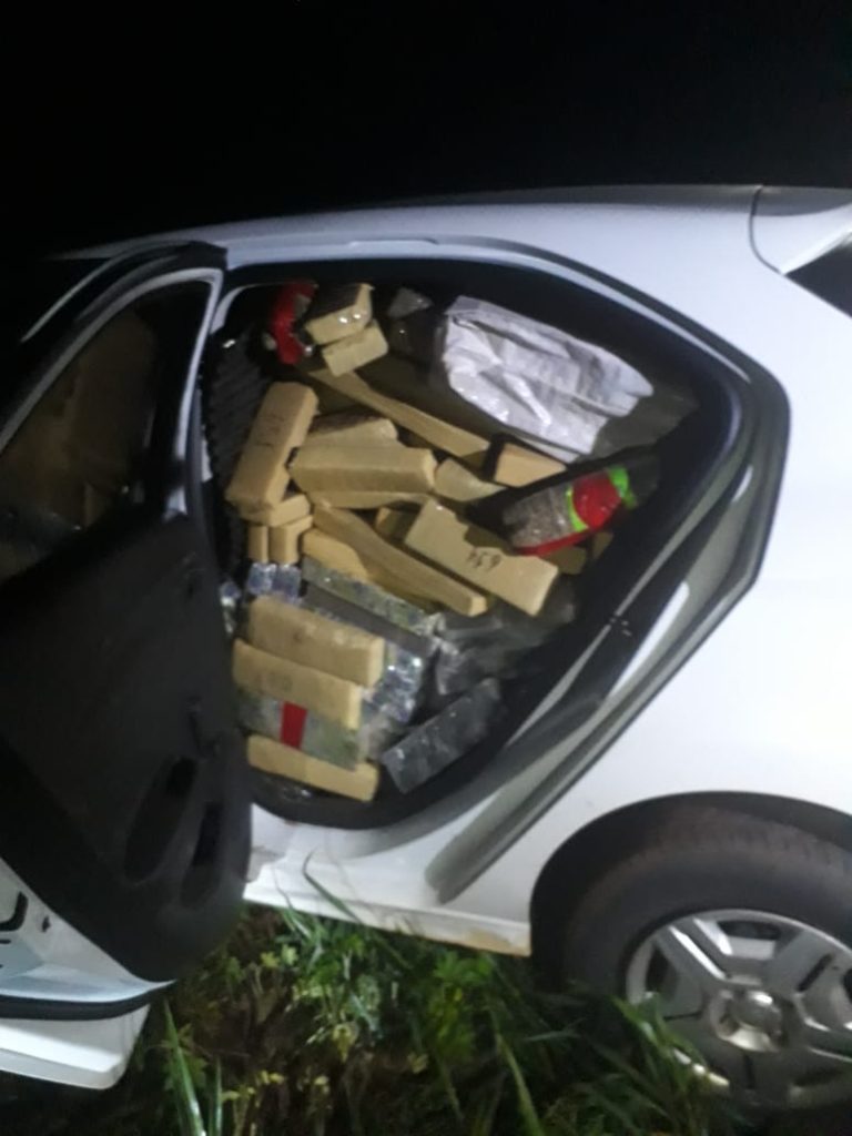 No Ônix foram encontradas 781 kg de maconha, separados em tabletes de 01 kg, um vidro de 210 ml com maconha e quatro garrafas de plástico de dois litros com sementes de maconha.