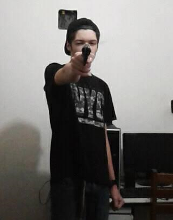 Foto mostra o atirador apontando um símbolo de arma na cabeça