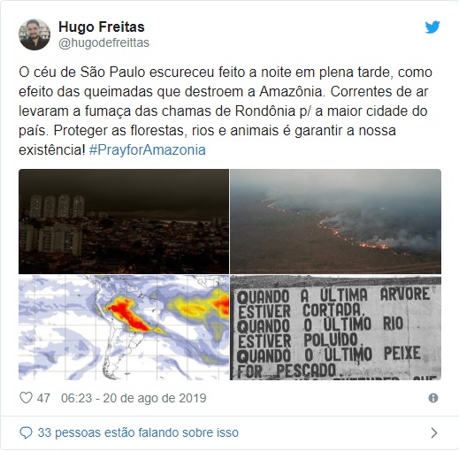 Na segunda-feira (19), a cidade de São Paulo, parte de Mato Grosso do Sul e do norte do Paraná foram atingidos pela fumaça dos incêndios do Norte brasileiro e também do Paraguai.