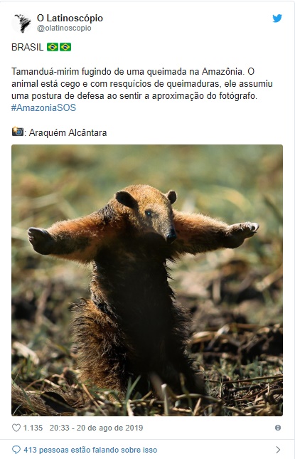 A imagem de um tamanduá cego e com resquícios de queimaduras fugindo das chamas viralizou na web.