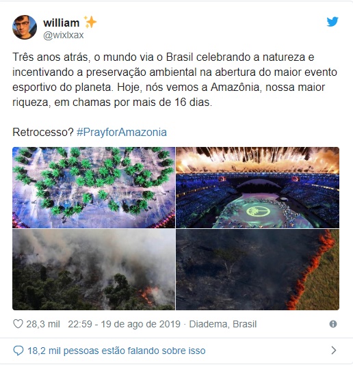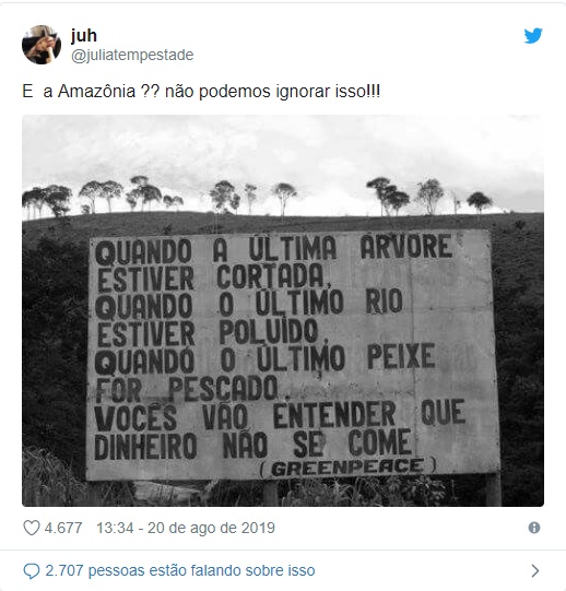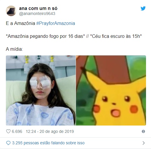Internautas no Twitter estão expressando preocupação pela situação ecológica e acusando o governo brasileiro, em particular o presidente Jair Bolsonaro, e a mídia por ignorar o incêndio, que pode trazer consequências catastróficas não só para o Brasil, mas para todo o mundo.