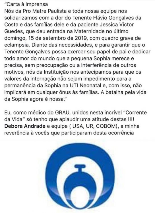 “Nós da Pro Matre Paulista nos solidarizamos com a dor do Tenente Flávio Gonçalves da Costa e das famílias dele e da paciente Francisca Jessica Victor Guedes, que deu entrada na Maternidade no último sábado, 14 de setembro de 2019, com morte cerebral devido a caso grave de eclâmpsia. Nosso compromisso é garantir que o Tenente Gonçalves possa exercer seu papel de pai e dedicar todo amor que a pequena Sophia precisa. Assim, nós da Instituição nos antecipamos para que os valores da internação não sejam impedimento para a permanência da Sophia na UTI Neonatal e, com isso, não implicará em qualquer ônus às famílias.”