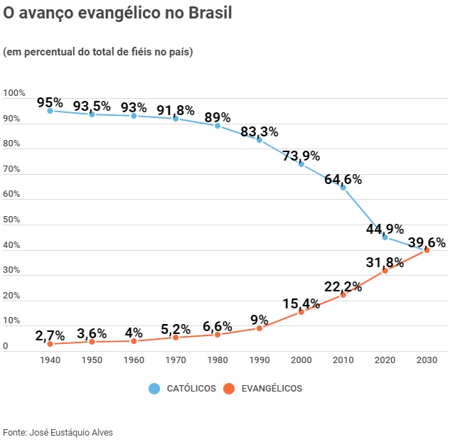 Os números constam em estudo do demógrafo José Eustáquio Alves, professor aposentado da Escola Nacional de Ciências Estatísticas do IBGE. Segundo o especialista, o número de brasileiros adeptos da religião evangélica cresce em média 0,8% ao ano desde 2010, enquanto a quantidade de católicos diminui 1,2% no mesmo período. Com isso, a progressão geométrica aponta para que cada uma das duas religiões correspondam a cerca de 40% da população em 2032 (veja quadro abaixo). Se a curva se mantiver, a partir daquele ano, portanto, os evangélicos devem se tornar maioria no país.