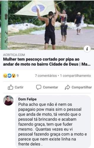 Um homem identificado como “Dom Felipe” escreveu nos comentários da publicação de um veículo de comunicação que a culpa era da vítima, que acabou com “brincadeira” e que motociclistas “tinham mais era que se foder”.
