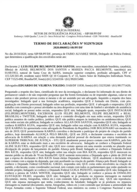 Em um deles (veja a íntegra abaixo), o de Luis Felipe de Belmonte, vice-presidente do Aliança pelo Brasil, realizado no dia 20 de outubro, a PF questiona quem paga as despesas de comunicação do partido em formação e menciona transferências financeiras feitas por Belmonte à empresa Inclutech, de Sergio Lima, publicitário do partido.