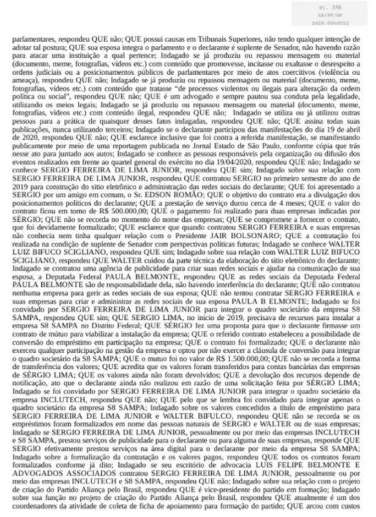 "Indagado se foi convidado por SERGIO FERREIRA DE LIMA JUNIOR para integrar o quadro societário da empresa S8 SAMPA, respondeu QUE sim; QUE SERGIO LIMA, no inicio de 2019, precisava de recursos para instalar a empresa S8 SAMPA no Distrito Federal; QUE SÉRGIO fez uma proposta para que o declarante firmasse um contrato de mútuo para viabilizar a instalação da empresa; QUE o referido contrato estabeleceu a possibilidade de conversão do empréstimo em participação na empresa; QUE o contrato foi formalizado; QUE o declarante não exerceu qualquer participação na gestão da empresa e optou por não exercer a cláusula de conversão para integrar o quadro societário da S8 SAMPA; QUE o mutuo foi no valor de R$ 1.500.000,00; QUE não se recorda a forma de transferência dos valores; QUE acredita que os valores foram transferidos para contas bancárias das empresas de SÉRGIO LIMA; QUE os valores ainda não foram devolvidos". Segundo o depoimento, a S8 Sampa foi posteriormente adquirida pela Nova SB, que detém contratos com o governo federal por meio do BNDES e da Apex. O montante de R$ 1,5 milhão foi pago em duas vias. Uma, de R$ 1,050 milhão. para Lima, e o restante, R$ 450 mil, para o sócio de Lima, Walter Scigliano.