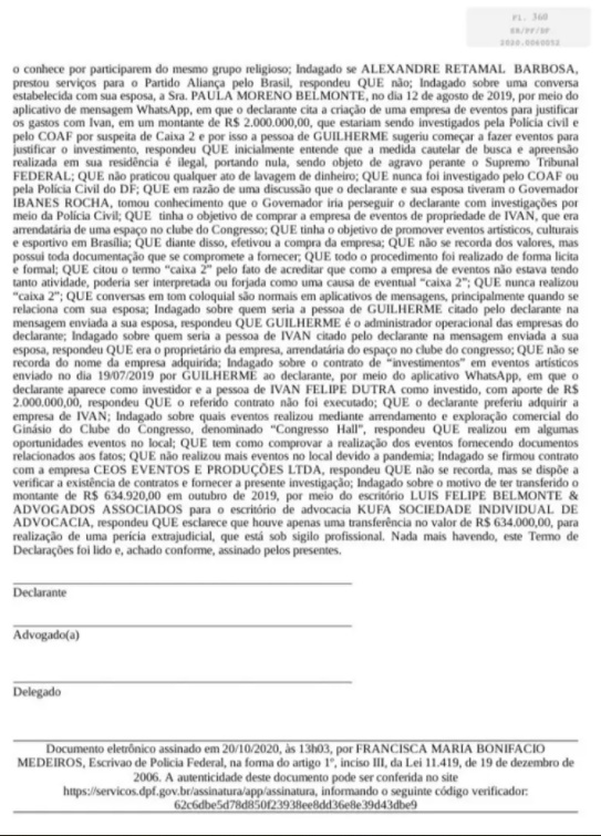 "Indagado sobre uma conversa estabelecida com sua esposa, a Sra. PAULA MORENO BELMONTE, no dia 12 de agosto de 2019, por meio do aplicativo de mensagem WhatsApp, em que o declarante cita a criação de uma empresa de eventos para justificar os gastos com Ivan, em um montante de R$ 2.000.000,00, que estariam sendo investigados pela Polícia civil e pelo COAF por suspeita de Caixa 2 e por isso a pessoa de GUILHERME sugeriu começar a fazer eventos para justificar o investimento, respondeu QUE inicialmente entende que a medida cautelar de busca e apreensão realizada em sua residência é ilegal, portando nula, sendo objeto de agravo perante o Supremo Tribunal FEDERAL; QUE não praticou qualquer ato de lavagem de dinheiro; QUE nunca foi investigado pelo COAF ou pela Polícia Civil do DF; QUE em razão de uma discussão que o declarante e sua esposa tiveram o Governador IBANES ROCHA, tomou conhecimento que o Governador iria perseguir o declarante com investigações por meio da Polícia Civil; QUE tinha o objetivo de comprar a empresa de eventos de propriedade de IVAN, que era arrendatária de uma espaço no clube do Congresso; QUE tinha o objetivo de promover eventos artísticos, culturais e esportivo em Brasília." Guilherme, segundo o próprio Belmonte, é "o administrador operacional de suas empresas". Já Ivan era o proprietário de uma empresa que arrenda um espaço de eventos no Clube do Congresso, em Brasília.
