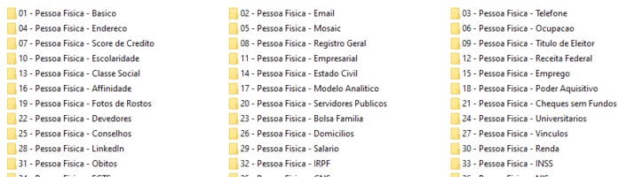 No total, são 37 bases que incluem todo tipo de dado pessoal, incluindo RG, estado civil, lista de parentes, endereço completo (com latitude e longitude), nível de escolaridade, salário, renda, poder aquisitivo, status na Receita Federal e INSS, entre muitos outros.