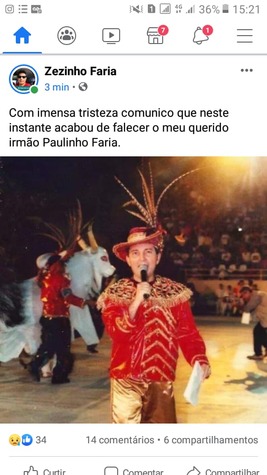 A informação foi confirmada pelo irmão dele, Zezinho Faria, no Facebook. "Com imensa tristeza comunico que neste instante acabou de falecer o meu querido irmão Paulinho Faria". Paulinho estava internado desde o início do mês, inicialmente no hospital Jofre Cohen, em Parintins, e depois em uma unidade particular de Manaus.