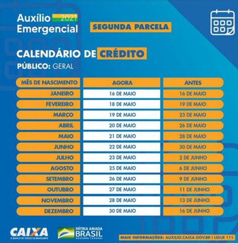 Na última quinta-feira (13), a Caixa anunciou a antecipação do pagamento da segunda parcela. O calendário de depósitos, que começou no último domingo (16) e terminaria em 16 de junho, teve o fim antecipado para 30 de maio.
