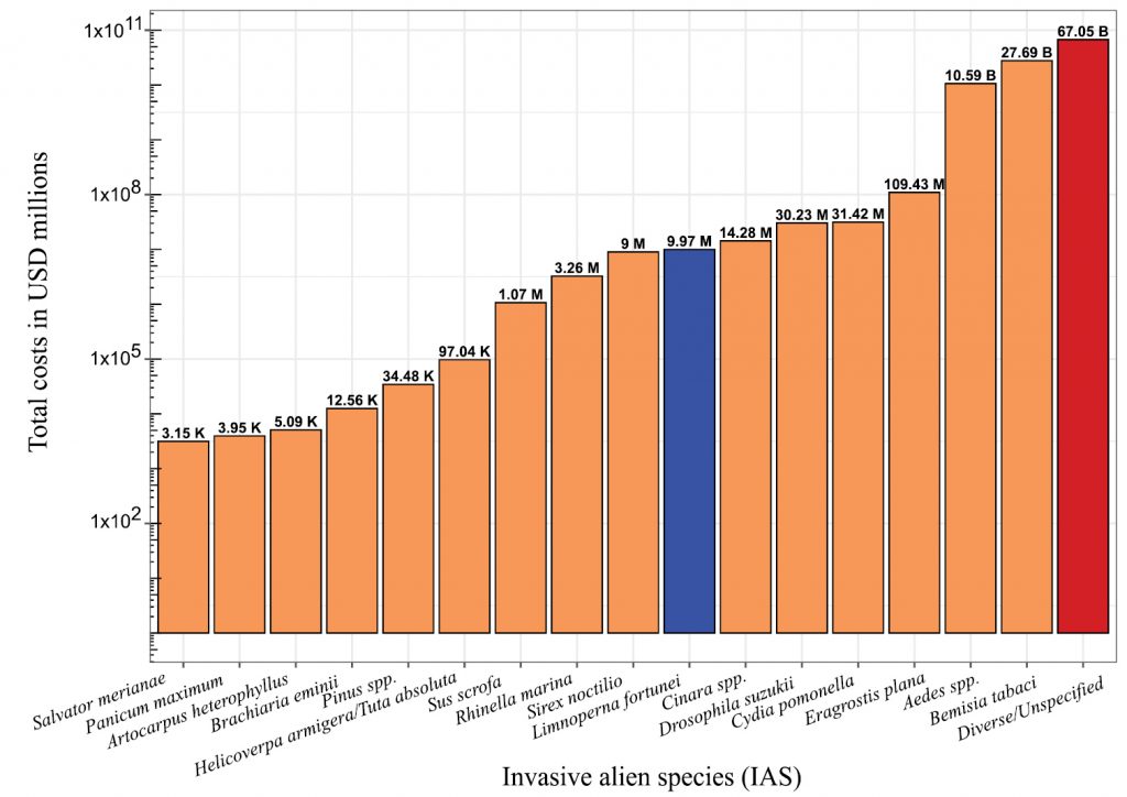 Há uma grande variabilidade dos custos por espécies, o menor valor foi do teiú (Salvator merianae), com US$ 3,15 mil, e o maior foi da mosca branca (Bemisia tabaci), com US$ 27,69 bilhões. A agricultura foi a área mais prejudicada, seguida da saúde.