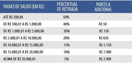 O saque-aniversário permite o resgate de 50% do fundo (para quem tem até R$ 500 na conta) até 5% mais um adicional (para quem tem acima de R$ 20 mil). Ou seja, o percentual vai caindo conforme a quantidade de dinheiro depositado aumenta.