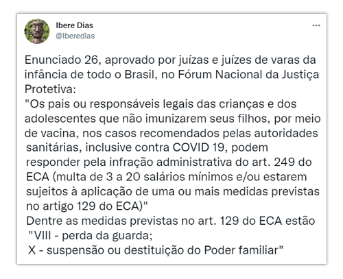 O juiz Ibere de Castro Dias é um defensor da imunização infantil. Em postagem recente no Twitter, o magistrado afirmou: