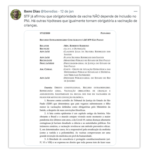 Em outro momento, o juiz relembrou um julgamento ocorrido no STF, no qual os ministros reconheceram a obrigatoriedade de vacinação de crianças e adolescentes, ainda que contrarie convicção filosófica de mães e pais.