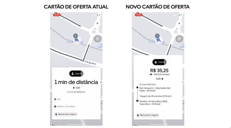 A intenção é que os motoristas tenham mais dados no Uber para aceitarem uma viagem. Antes, apenas a distância, o bairro de destino e a nota do cliente eram informados antes da corrida. Agora, vai ser possível conferir o valor exato e o destino final, dados que só eram liberados após a corrida ser aceita.