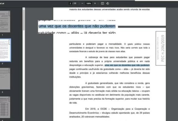 Em seu relatório, Kim Kataguiri votou pela admissibilidade da PEC. "O núcleo do direito fundamental social à educação é, portanto, a educação gratuita de ensino fundamental, porque é este tipo de educação que permite que a pessoa tenha sua formação básica e ascenda aos outros níveis de ensino. No ensino superior, o aluno já é adulto e muitas vezes pode conciliar trabalho e estudo. É verdade que há casos de alunos no ensino superior em condição de pobreza - e estes devem continuar a ter o benefício da gratuidade - mas permitir que o Estado cobre mensalidades em cursos superiores dos alunos abastados nem de longe altera o núcleo do direito fundamental social à educação", afirmou o deputado no texto.
