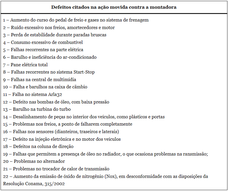 Os representantes dos MPs também chamam a atenção para outros vícios de fabricação que podem causar graves riscos aos consumidores, motoristas e passageiros, em defeitos relatados “envolvendo os sistemas de freios – ABS – e câmbio, uma vez que não ocorre uma frenagem adequada e, no momento de parada brusca, os veículos jogam a traseira para a lateral. Ainda há reclamações quanto ao consumo médio de combustível dos veículos e falhas recorrentes no sistema start-stop, na central de multimídia e na parte elétrica, como o disparo de sensores e pane elétrica com paralisação total do veículo, até mesmo em rodovias”, escreveram.