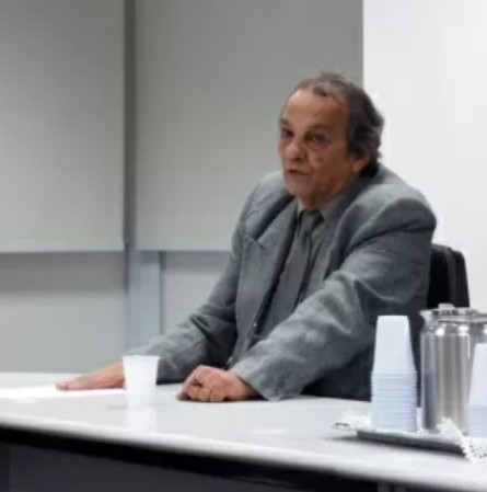 Delegado Aparecido Laertes Calandra em audiência da Comissão Nacional da Verdade, em 2014, sobre imagens de Vladimir Herzog, torturado e morto em 1975 | Foto: Marcelo Camargo/Agência Brasil
